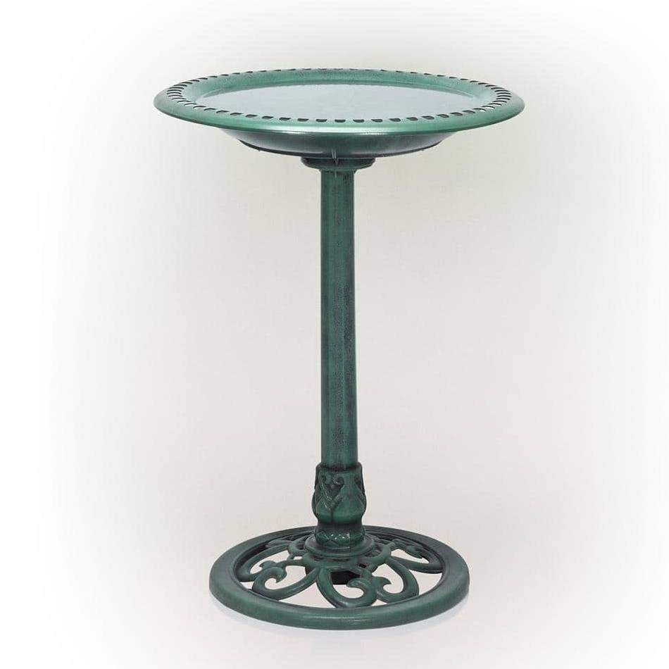 Attract feathered friends to your yard with this beautiful green bronze finish outdoor birdbath. Fill the bird bath with fresh water and enjoy watching all the birds congregate near your patio, garden, deck, yard, or pool. This high-quality bird bath features a gorgeous polypropylene design with perforated edges on the basin all painted with a green color - great for adding an elegant touch to your outdoor Decor. It is perfect for pairing with a bird feeder to coax a variety of birds outside your window during any season. The sturdy base keeps the birdbath from tipping over while the plastic construction withstands weather changes. Your yard will be the delight of humans and winged creatures alike.